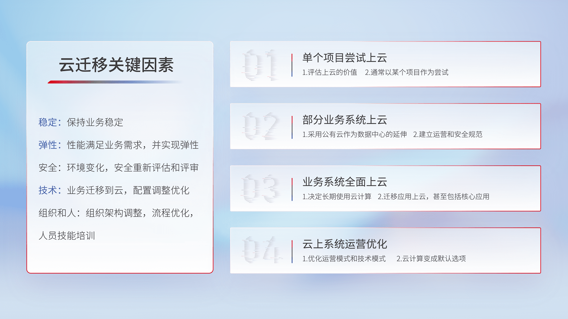结合实际业务,,,从规划设计、、、、云平台选型、、、、云原生改造、、数据迁移、、、集成交付,,迁移全过程为客户识别最佳上云路径,,,,做好风险识别管理,,,设计网络架构、、身份权限、、安全审计合规、、、、操作审计、、、日志审计、、、、监控告警策略、、、、多站点容灾设计等,,,对云上基础设施进行整体规划,,提升IT治理水平,,以满足弹性、、、高可用、、、高性能的需求。。。。
